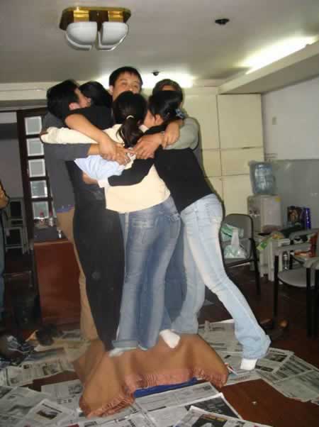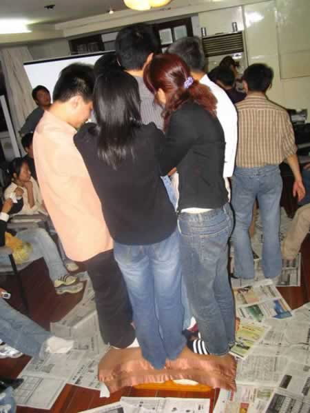 “抱團打天下”游戲:7人合力站在小小的啤酒箱上,堅持1分鐘以上才算過關。此游戲可以訓練團隊合作精神,考驗意志力和增強組員的相互協調與團結能力。