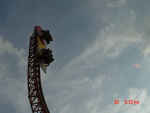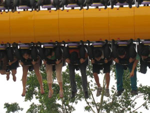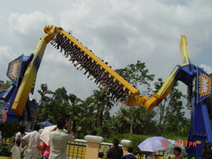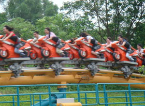 十環(huán)過山車 最聲名顯赫的游戲,亞洲首臺、全世界第二臺(僅在英國有一臺)、單項設備投資超過人民幣一億元,打破游樂設備環(huán)數最多的世界記錄,并創(chuàng)造了世界吉尼斯記錄。