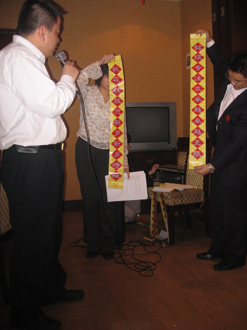表彰大會(huì)結(jié)束后,進(jìn)入了豬年迎春晚會(huì)的階段,首先進(jìn)行了傳統(tǒng)風(fēng)味濃郁的對聯(lián)節(jié)目。