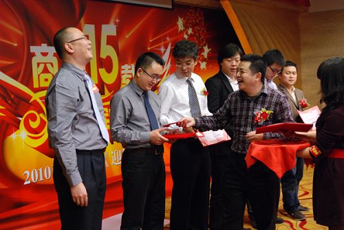 接著頒發(fā)的是商科09年部門之星獎(jiǎng),由集團(tuán)熊總頒發(fā)。這些員工2009年工作成績(jī)表現(xiàn)突出,由公司各部門民主推選獲得,我們向他們表示祝賀
