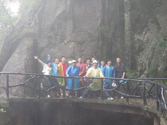 結束語:雖然本次旅游的時間由于客觀原因推遲了一些, 途中還下了點小雨,但是這些都沒有影響到大家的心情,也許穿著雨衣爬山對于很多同事來說是人生的另一番體驗,額頭上除了汗水還有雨水,溫溫的汗水混合涼涼的雨水,給各自帶來的靈感,只有自己才知道。下山后,晴朗的天氣,依然給了大家一個保持良好心情的理由。人生的旅途,不會一帆風順,也總是要經歷風雨之后才能見晴空,大家在經歷風雨的時候,請一定要記住,晴空就在前方,祝福大家。
