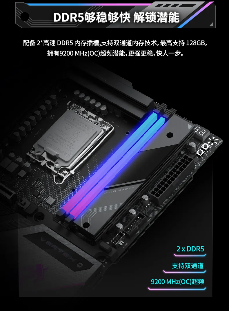 MS-iCraft Z890 Vertex(珠峰)板載銳影屏+超頻特化,同時擁有2xThunderbolt™ 4,高達9個USB 10G接口,PCIE5.0 x16顯卡插槽+PCIE5.0 x4 M.2接口,支持PCIE5.0通道拆分,2*SFF-8654 4i拓展接口,盡顯旗艦實力。