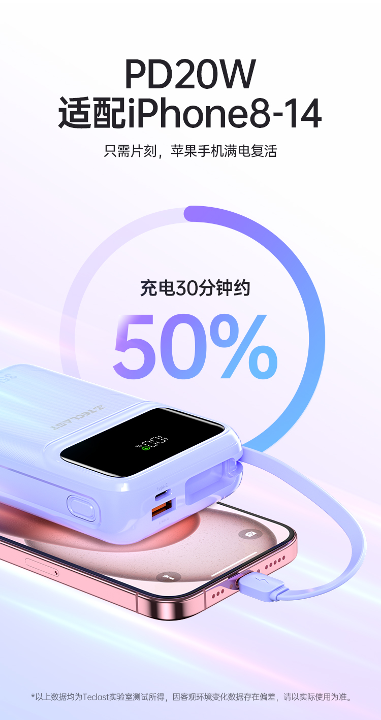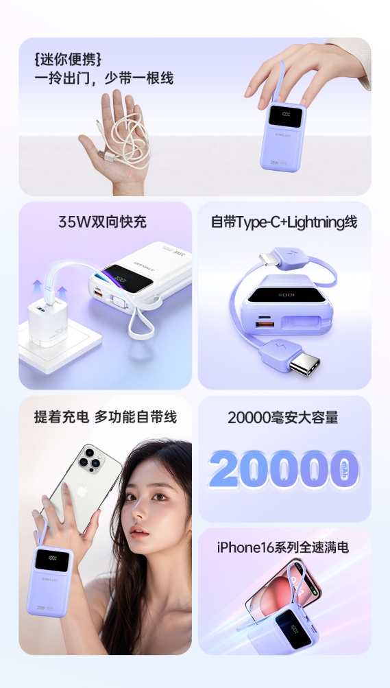 除了容量和快充功能,臺(tái)電 Teclast Q20 Pro 還自帶了一條 Type-C 線和一條 Lightning 線,適用于蘋果 iPhone 6~16 以及安卓設(shè)備。這意味著你無(wú)需再為不同設(shè)備準(zhǔn)備不同的充電線,就可以為你的所有設(shè)備充電,數(shù)字顯示屏也是這款移動(dòng)電源的一個(gè)實(shí)用功能。你可以隨時(shí)查看剩余電量,了解移動(dòng)電源的使用情況,避免在關(guān)鍵時(shí)刻出現(xiàn)電量不足的情況。