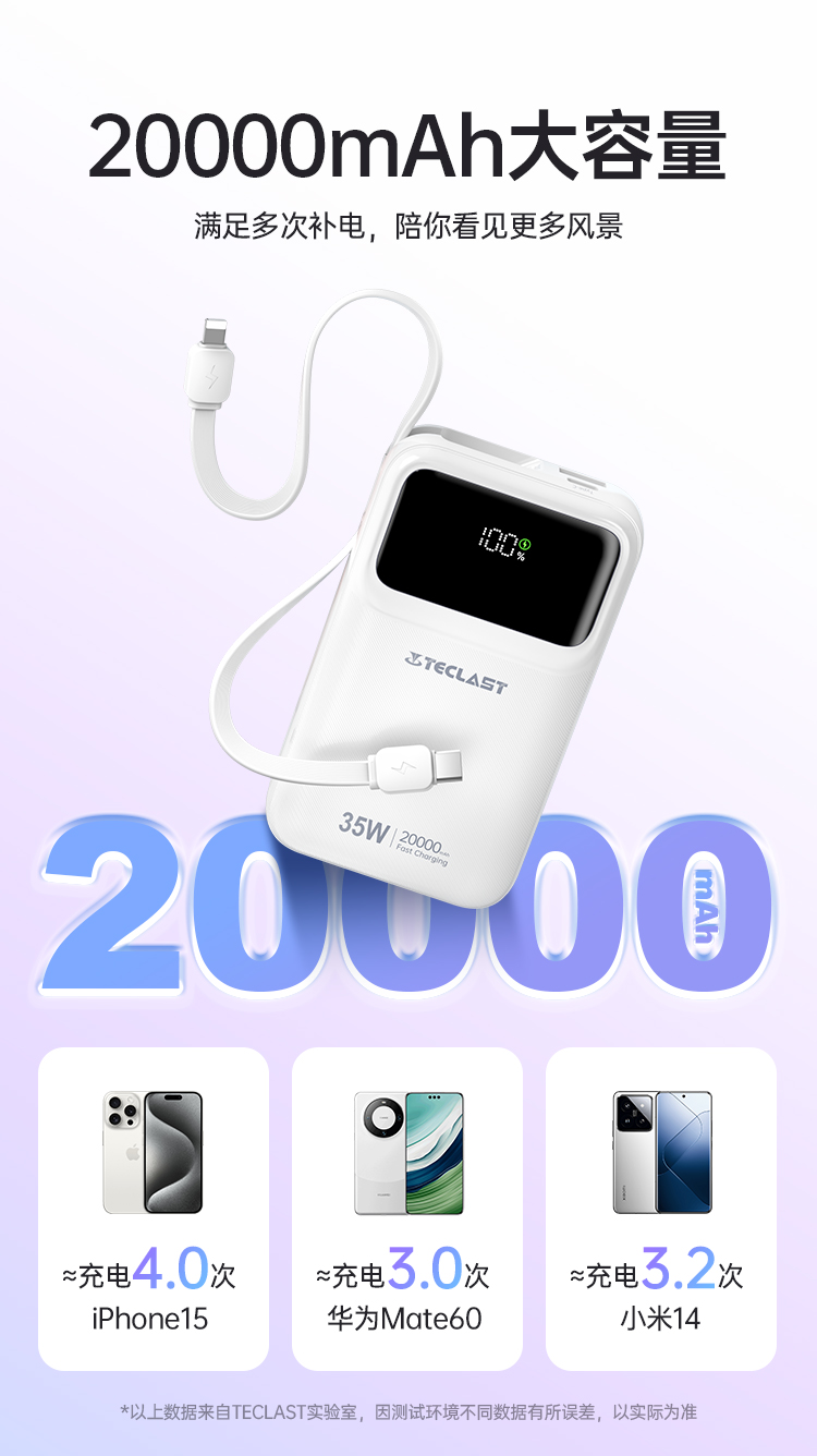 如今,臺(tái)電Teclast洞察到消費(fèi)者對(duì)充電速度的需求,重磅推出一款35W高功率輸出的充電寶,不僅能夠滿足蘋果手機(jī)用戶的快充需求,更以20000mAh的大容量和自帶雙線快充以及數(shù)字顯示屏等眾多優(yōu)勢(shì),成為了眾多用戶的首選。