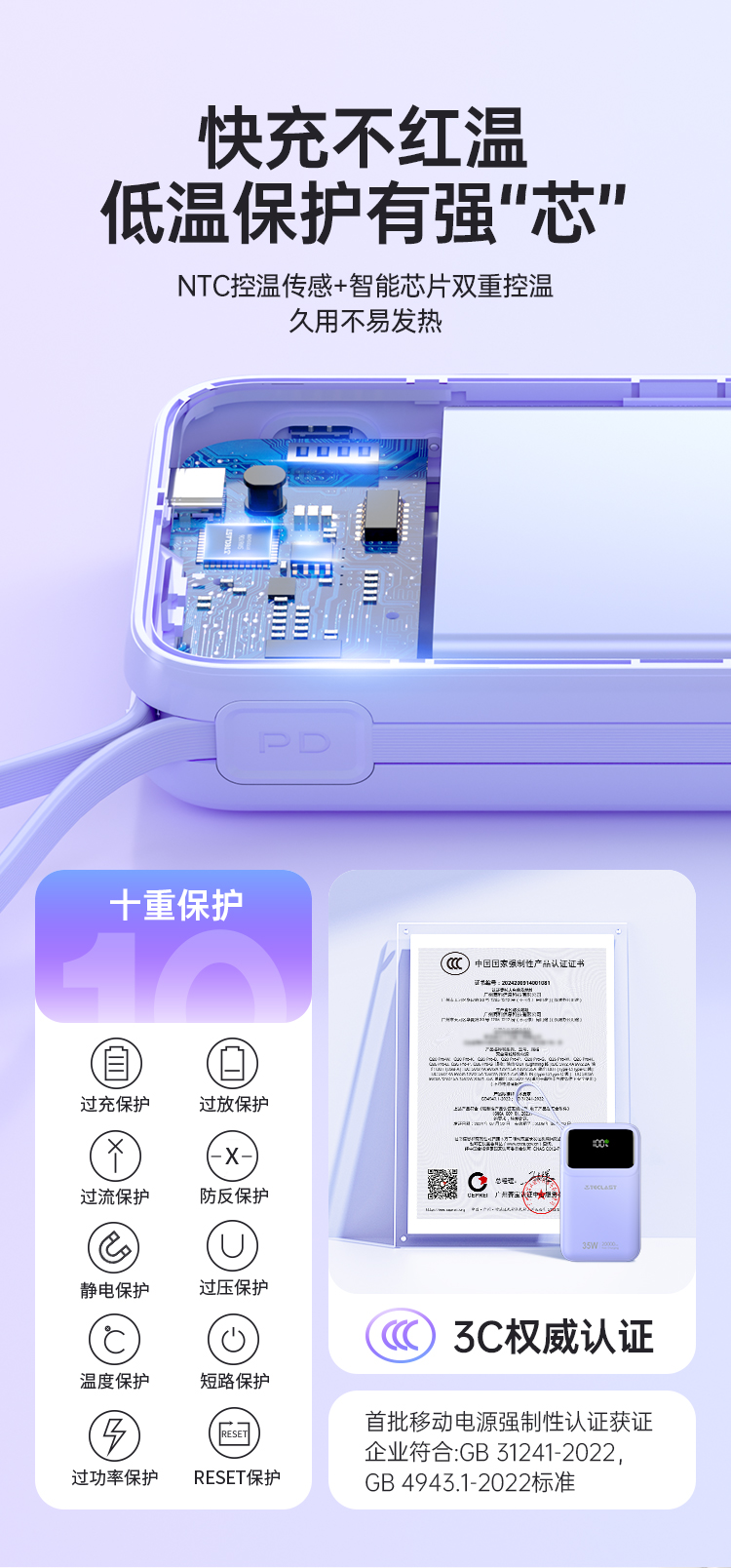 同時(shí),隱藏式充電線凹槽的設(shè)計(jì)也非常貼心,你可以隨時(shí)把線收納起來(lái),使移動(dòng)電源更加整潔美觀。在安全性方面,臺(tái)電Teclast Q20 Pro 采用了 NTC 控溫傳感 + 智能芯片雙重控溫技術(shù),久用不易發(fā)熱。這不僅可以延長(zhǎng)移動(dòng)電源的使用壽命,還可以保證你的設(shè)備在充電過(guò)程中的安全,讓你放心使用。