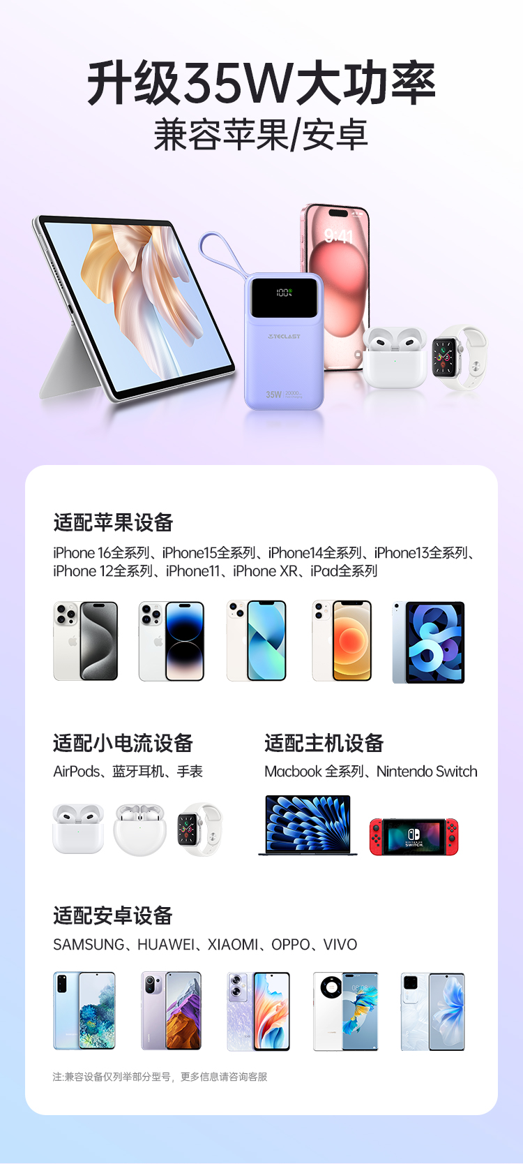 此外,它還支持 22.5W 的華為 SCP 超級(jí)快充,兼容各種智能手機(jī)、蘋果設(shè)備、藍(lán)牙耳機(jī)等等,無(wú)需擔(dān)心你的設(shè)備不兼容。