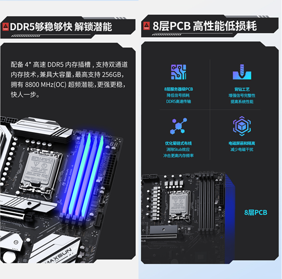 內存拓展與性能表現上,這款主板同樣實力出眾。它配備4*高速DDR5內存插槽,支持雙通道內存技術,兼具大容量,最高支持256GB,擁有8800 MHz(OC)超頻潛能,更強更穩。再加上英特爾酷睿 Ultra 7 265K 處理器對 CUDIMM內存的支持,更為沖擊高內存頻率提供了可能。對游戲玩家和追求高性能的用戶來說,高頻內存能夠有效提升系統的數據讀寫速度,減少游戲加載時間,提升多任務處理能力,帶來更流暢的畫面切換和更快的場景加載體驗。此外,主板采用 8 層服務器級 PCB 設計,配合背鉆工藝和優化的菊鏈式布線,有效降低信號損耗,增強信號完整性,消除 Stub 效應,不僅保障了 DDR5 內存的高速穩定傳輸,更減少了電磁干擾,為整套平臺的高性能運行奠定了堅實基礎。