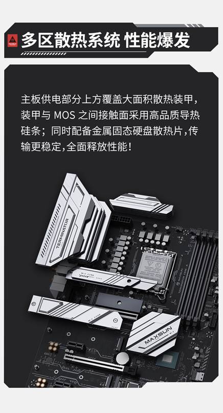 散熱能力是保障硬件長期穩定運行的關鍵,銘瑄 MS-Terminator Z890-A WIFI 主板在散熱設計上同樣下足了功夫。主板供電部分上方覆蓋了大面積散熱裝甲,裝甲與 MOS 之間的接觸面采用高品質導熱硅條,能夠快速導出供電模塊工作時產生的熱量;同時,主板還配備了金屬固態硬盤散熱片,有效降低固態硬盤在高速傳輸數據時的溫度,確保其傳輸穩定性,全面釋放存儲性能。在這套強悍的多區散熱系統加持下,即便英特爾酷睿 Ultra 7 265K 處理器長時間高負載運行,主板也能保持較低溫度,避免因過熱導致的性能降頻,讓玩家在長時間鏖戰游戲或進行專業創作時無后顧之憂。