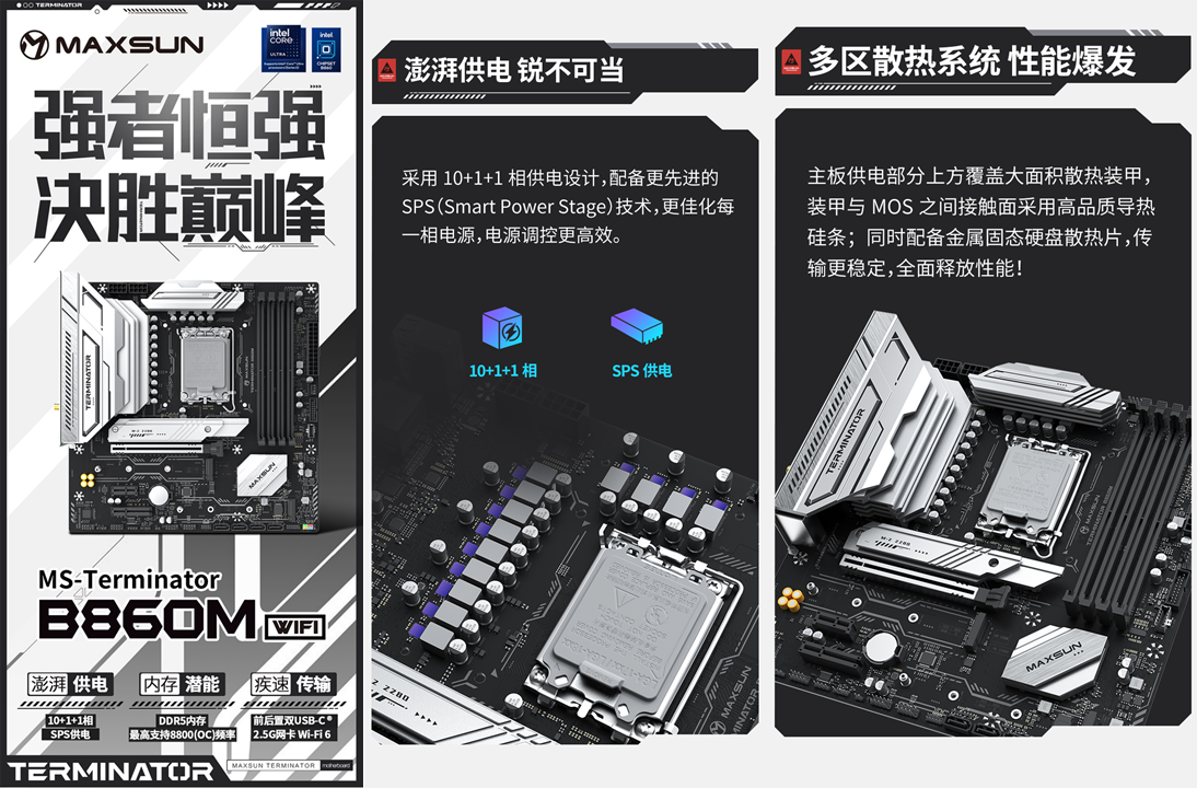 好馬配好鞍,想要充分釋放處理器的性能,一塊適配且性能強悍的主板必不可少。銘瑄Terminator B860M WIFI主板采用Micro-ATX板型,外觀上延續了終結者系列的經典撞色設計,黑色PCB搭配銀白色散熱裝甲,黑色 PCB 搭配銀白色散熱裝甲,低調中盡顯質感,擺在機箱中就是一道亮眼的風景。供電方面這款主板也是誠意滿滿,采用了10+1+1 相 SPS 供電設計,配備更先進的 SPS(Smart Power Stage)技術,更佳化每一相電源,使得電源調控更加高效穩定,穩定支持英特爾酷睿 Ultra 5 225F 處理器。即使處理器處于滿負載運行狀態,也能持續輸出穩定電力,避免卡頓掉幀等問題。為了讓供電系統時刻保持冷靜,主板供電部分上方覆蓋大面積散熱裝甲,裝甲與 MOS之間接觸面采用高品質導熱硅條,能快速傳導并散發運行時產生的熱量;同時還配備金屬固態硬盤散熱片, 讓硬件性能全面釋放,傳輸更穩定。