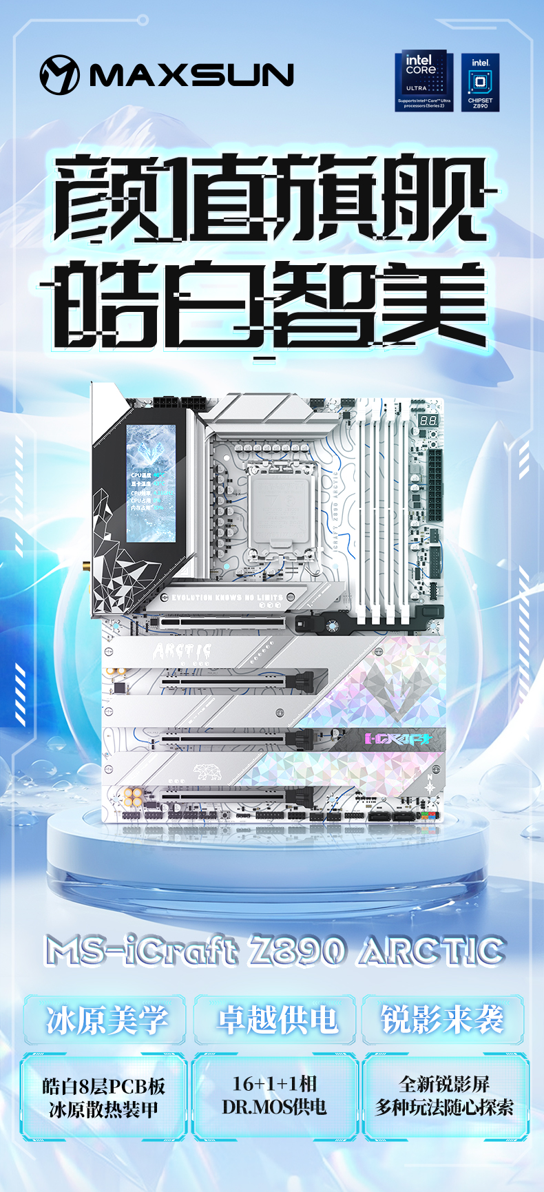 MS-iCraft Z890 Arctic(北冰洋),新一代冰原美學設計,科技與自然美感融合給用戶帶來不一樣的視覺與性能體驗。擁有2*USB4® 40G接口,高達9個USB 10G接口,1*SFF-8654 4i拓展接口,PCIe 5.0 x16顯卡插槽+PCIe 5.0 x4 M.2接口,支持PCIe 5.0通道拆分,外觀性能雙旗艦。