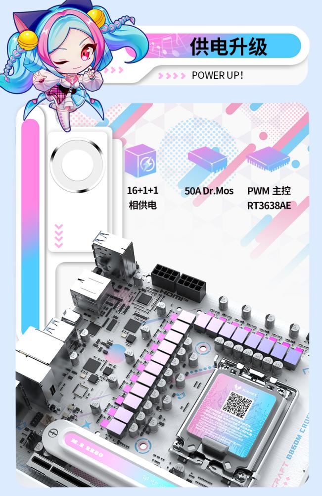 鐘愛Q版璦珈的用戶還可以選擇MS-iCraft B860M CROSS,主板配備LED小屏幕,通電后會呈現活力滿滿的小璦珈眨眼動畫,魅力滿分!