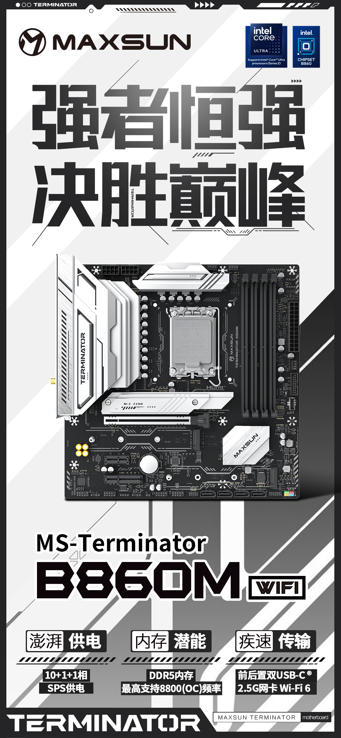 MS-Terminator B860M WIFI是銘瑄終結者系列的主流爆款,采用Micro-ATX板型,外觀上延續了終結者系列的經典撞色設計,黑色PCB搭配銀白色散熱裝甲,低調中透著科技感。供電部分覆蓋大面積散熱裝甲,裝甲與MOS之間采用高品質導熱硅條,快速傳導熱量,確保供電穩定。供電方面,其采用10+1+1相SPS供電設計,配備SPS智能供電技術,電源調控高效穩定,可充分釋放處理器的性能,即便處理器滿負載運行,也能避免卡頓、掉幀問題,內存方面,配備4條DDR5內存插槽,支持雙通道技術,最高支持192GB容量,擁有8800 MHz(OC)超頻潛能,更強更穩。搭配新處理器的內存優化,大幅提升系統讀寫速度與多任務處理能力。