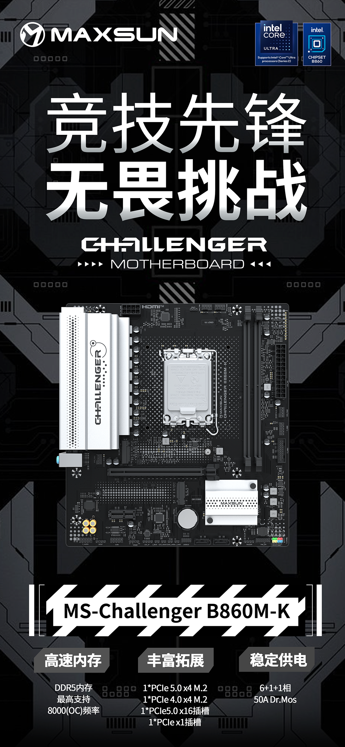 MS-Challenger B860M-K 則為入門用戶帶來高性價比之選,提供6+1+1相50A Dr.Mos穩定供電,2*M.2滿速接口,2*PCIe拓展插槽以及多達10個USB口,其中包括6個USB 5G接口,功能齊全實用,日常辦公與輕度電競都能輕松應對。