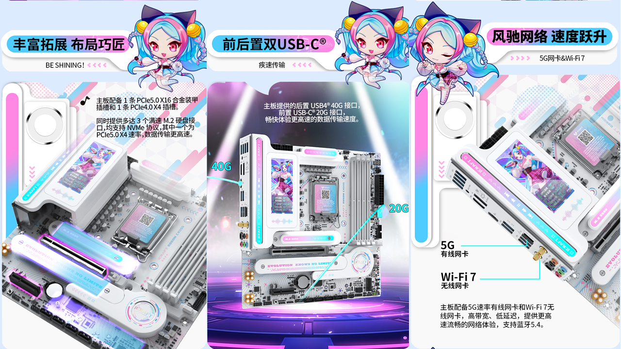 作為顏值旗艦,銘瑄iCraft B860M CROSS PRO璦珈主板將次元美學融入硬件設(shè)計。主板全覆蓋著藍粉漸變的二次元紋路,每一處細節(jié)都透著精致感。吸睛亮點莫過于全新配備的3.4英寸銳影LED顯示屏,不僅能實時顯示CPU溫度、內(nèi)存頻率等系統(tǒng)信息,讓玩家隨時掌握硬件狀態(tài),還能自定義開關(guān)機畫面,甚至支持桌面映射,同步展示專屬壁紙或游戲畫面。搭配配套軟件MAXSUN View,玩家可以盡情解鎖無限自定義玩法,讓主板成為主機的 “個性門面”。