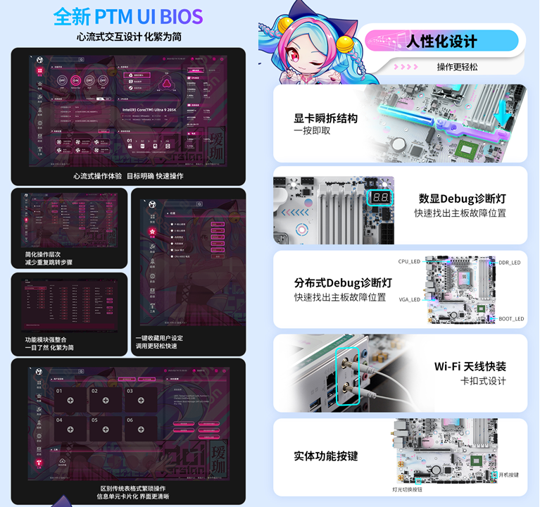 除了強悍的性能與豐富的功能,銘瑄 iCraft B860M CROSS PRO主板在操作便捷性和個性化打造上,也格外貼心,全方位提升用戶的使用與裝機體驗。全新升級的 PTM UI BIOS,借鑒了手機 APP 的交互邏輯,采用模塊化設(shè)計,交互層級不超過 2 層,卡片式的界面一目了然,就算是裝機新手,也能輕松搞定 BIOS 設(shè)置。同時主板配備顯卡瞬拆結(jié)構(gòu)和 Wi-Fi天線快裝設(shè)計,無需繁瑣操作,讓裝機、硬件升級更便捷;數(shù)顯+分布式 Debug 診斷燈能一眼識別故障位置,省去繁瑣排查步驟,讓玩家專注享受裝機與游戲的樂趣。