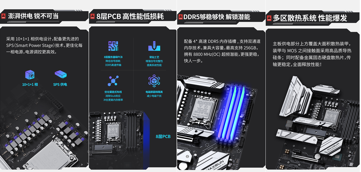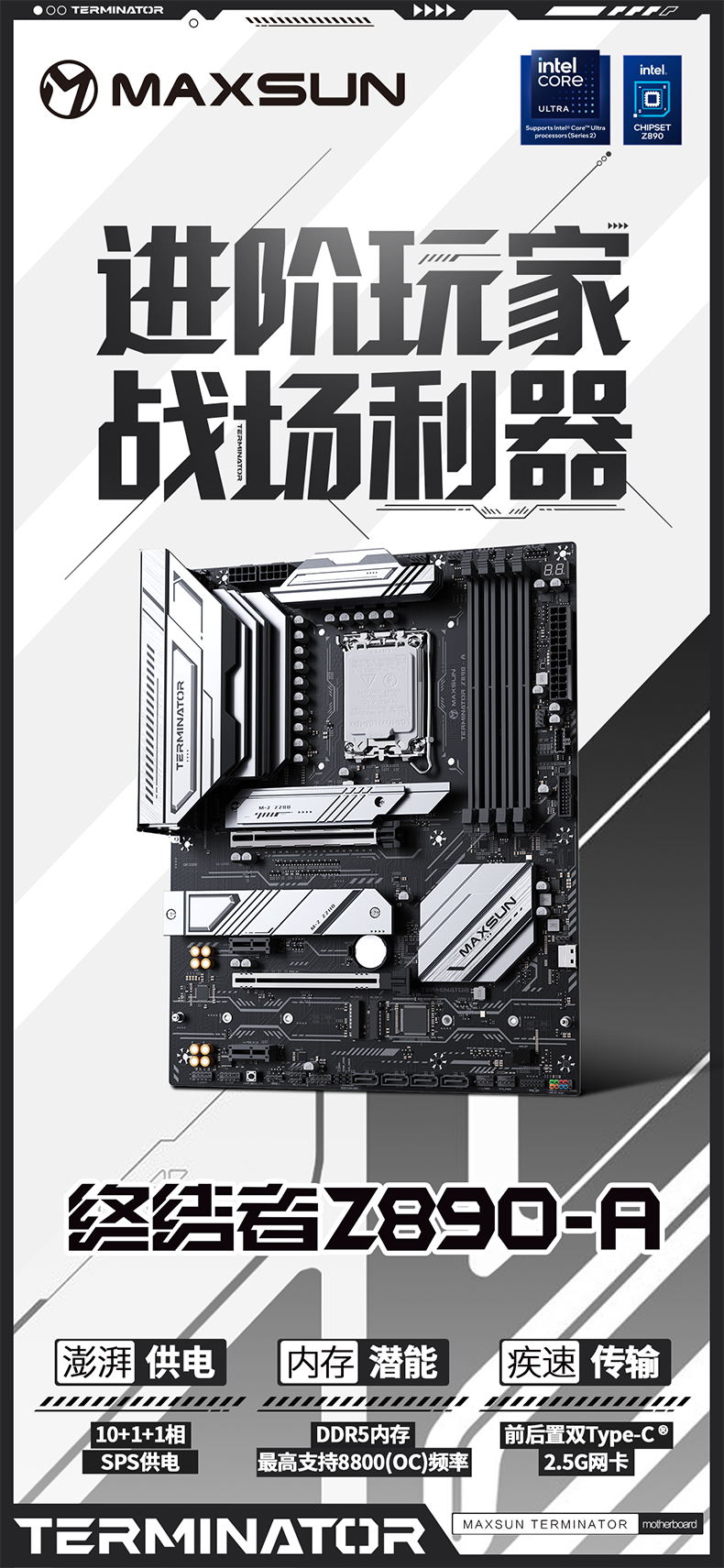 作為這款旗艦處理器的黃金搭檔,銘瑄 Terminator Z890-A 主板堪稱是為高性能電競體驗(yàn)量身打造的硬核裝備。主板基于 Intel Z890 芯片組打造,搭載 LGA 1851 插槽,與酷睿 Ultra 7 270K Plus 處理器實(shí)現(xiàn)原生無縫兼容,從硬件底層保障了性能的充分釋放。在內(nèi)存超頻方面,這款主板實(shí)力出眾,可沖擊 8800MHz 高頻,輕松突破內(nèi)存性能上限;采用 8 層服務(wù)器級 PCB 設(shè)計(jì),搭配背鉆工藝與菊鏈?zhǔn)絻?yōu)化布線,如同為高頻信號傳輸鋪設(shè)了一條 “高速專用通道”,能有效降低信號傳輸中的損耗與串?dāng)_,徹底消除電磁干擾與 Stub 效應(yīng),讓內(nèi)存的高速傳輸更穩(wěn)定、更流暢。內(nèi)存讀寫速度與多任務(wù)響應(yīng)速度的雙重提升,讓這款主板與酷睿 Ultra 7 270K Plus 處理器形成完美協(xié)同,共同實(shí)現(xiàn)了 15% 的游戲性能躍升,為電競高負(fù)載場景下的流暢運(yùn)行提供了堅(jiān)如磐石的硬件保障,讓玩家在激戰(zhàn)中告別卡頓,盡享絲滑操作體驗(yàn)。