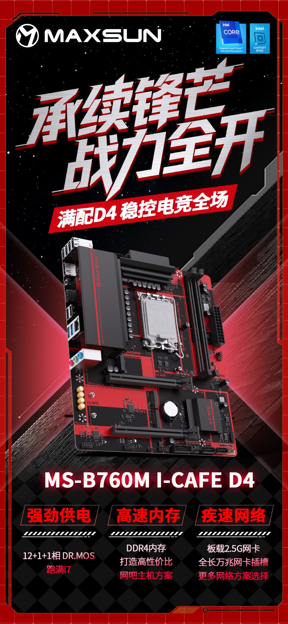 另一款 MS-B760M I-CAFE D4 則主打高性價(jià)比,是網(wǎng)咖打造主流電競主機(jī)的理想選擇。主板配備 12+1+1 相 DR.MOS 供電,供電穩(wěn)定且高效,為硬件運(yùn)行保駕護(hù)航;板載 2.5G 網(wǎng)卡,還配備全長萬兆網(wǎng)卡插槽,提供了更多網(wǎng)絡(luò)方案選擇,可根據(jù)網(wǎng)咖的實(shí)際規(guī)模與需求靈活搭配;支持 DDR4 內(nèi)存,在保證性能的同時(shí),進(jìn)一步控制整機(jī)成本,助力網(wǎng)咖打造高性價(jià)比的電競主機(jī)方案。