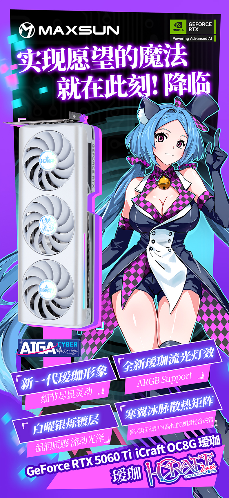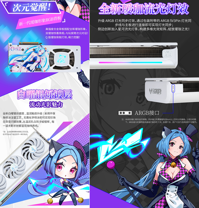 不僅性能能打,銘瑄GeForce RTX 5060 Ti iCraft OC8G 璦珈顯卡的顏值更是戳中玩家審美。全新白曜銀爍鍍層,溫潤觸感升級,采用環保免噴涂注塑工藝,無需化學噴涂就能呈現珍珠白漸變閃銀效果,從溫潤乳白到冷峻銀輝,每一道光影折射都獨具質感。搭配側邊創新加入的星河流光燈條,構建出多維光效矩陣,配合升級的 ARGB 燈光同步功能,只需通過包裝附帶的 ARGB 5V 3Pin 燈光同步線與主板連接,就能實現燈光聯動,讓主機機箱瞬間變身 "次元舞臺"。高強度合金背板暗藏巧思,全新Q版璦珈形象萌趣十足,與正面白調形成呼應,個性化拉滿。